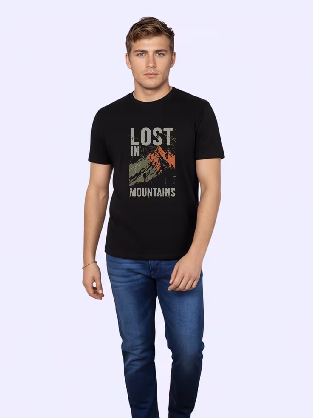 Find your calm with the Lost in Mountains T-shirt, half sleeves, soft cotton, crafted for mountain lovers who seek comfort and adventure together.