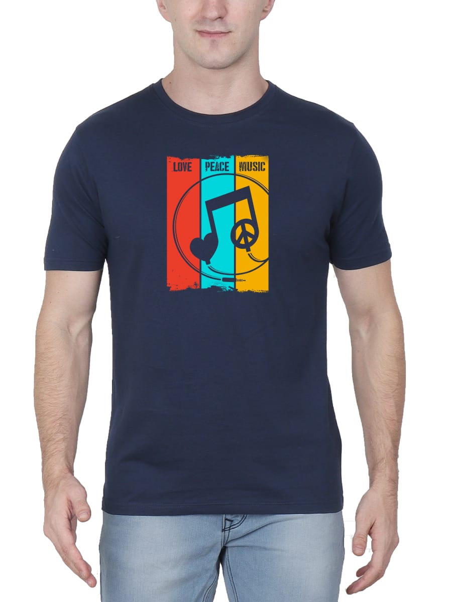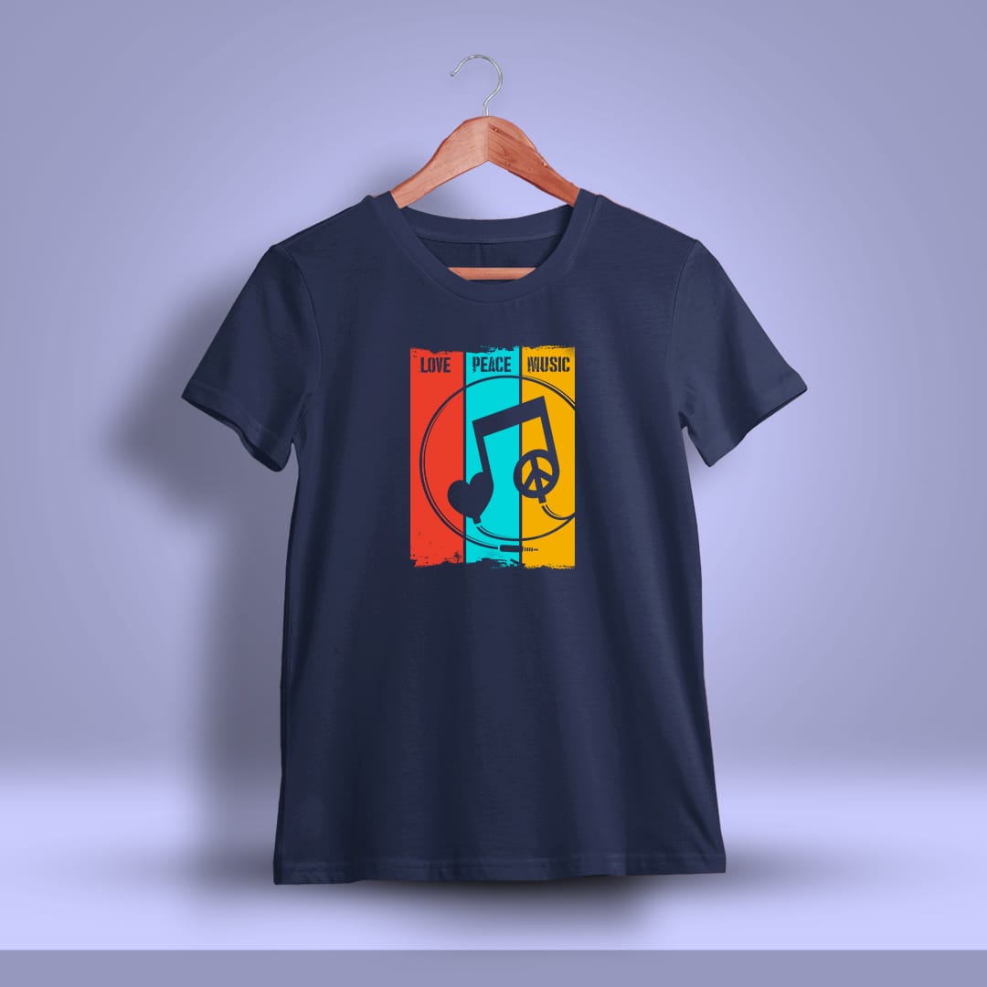 Spread positivity with this Love Peace Music Printed T-Shirt, celebrating love, peace, and music. A perfect choice for free spirits and music lovers everywhere.