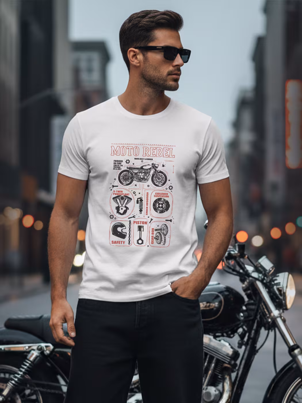 The Moto Rebel T-Shirt For Men – Half Sleeve blends style and comfort with minimalist motorcycle-inspired graphics, soft cotton fabric, and a perfect fit for everyday rides or casual adventures.