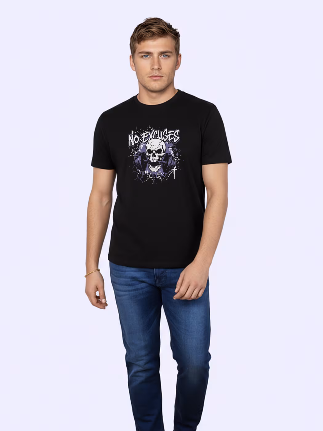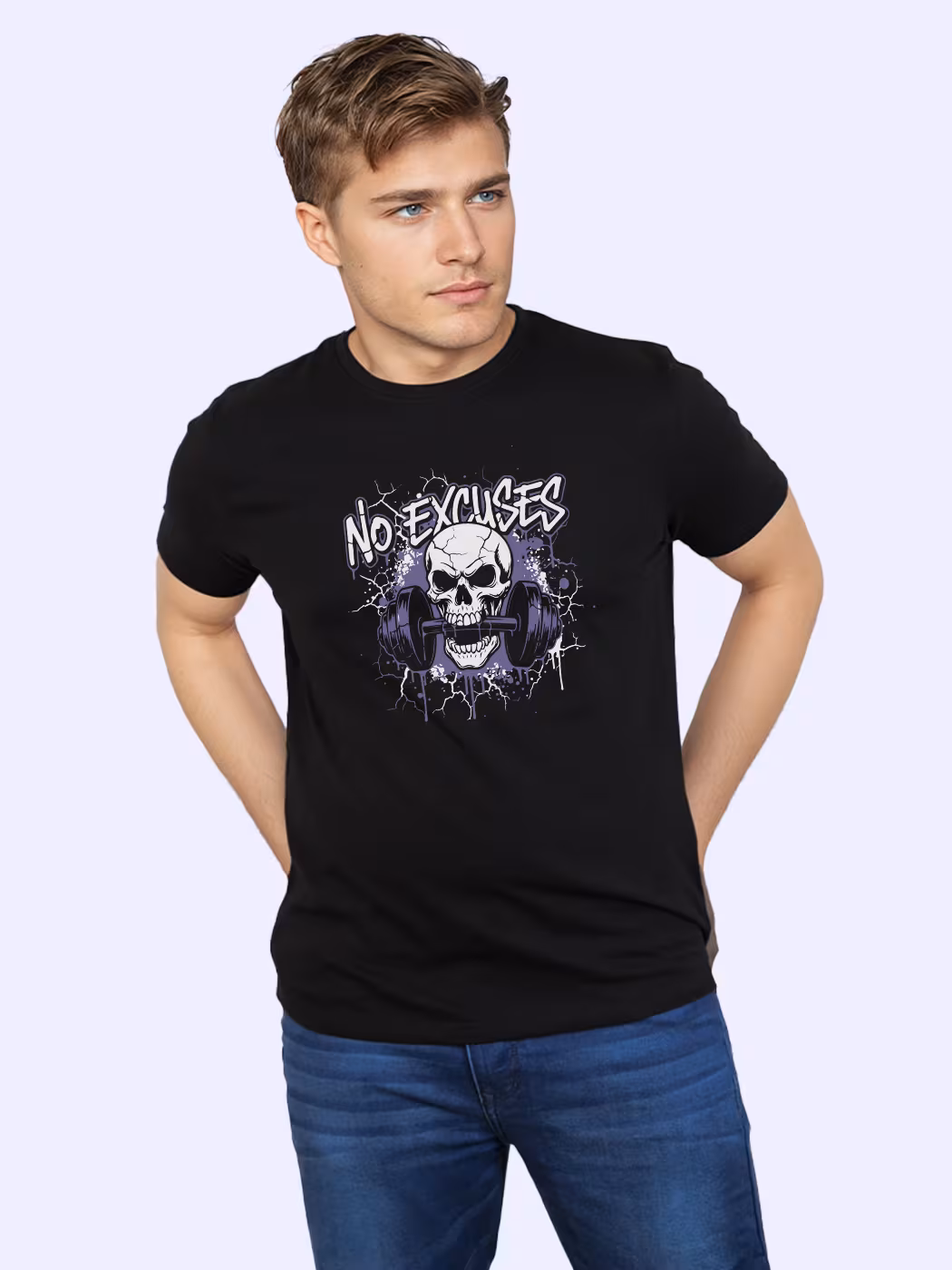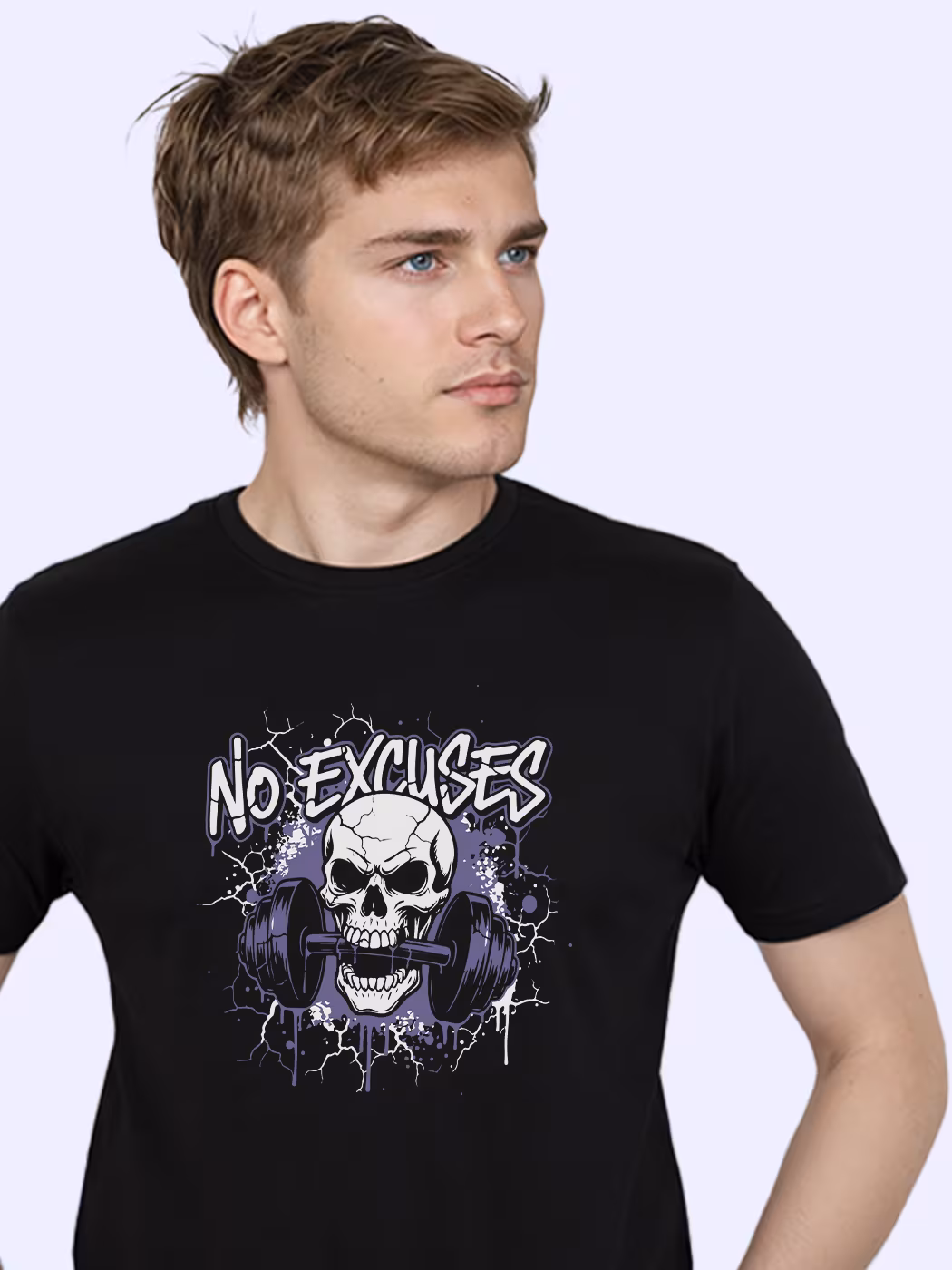 No Excuses T-shirt fuels determination. Half sleeve, breathable comfort with bold motivational print. A must-have for fitness enthusiasts committed to discipline and strength.