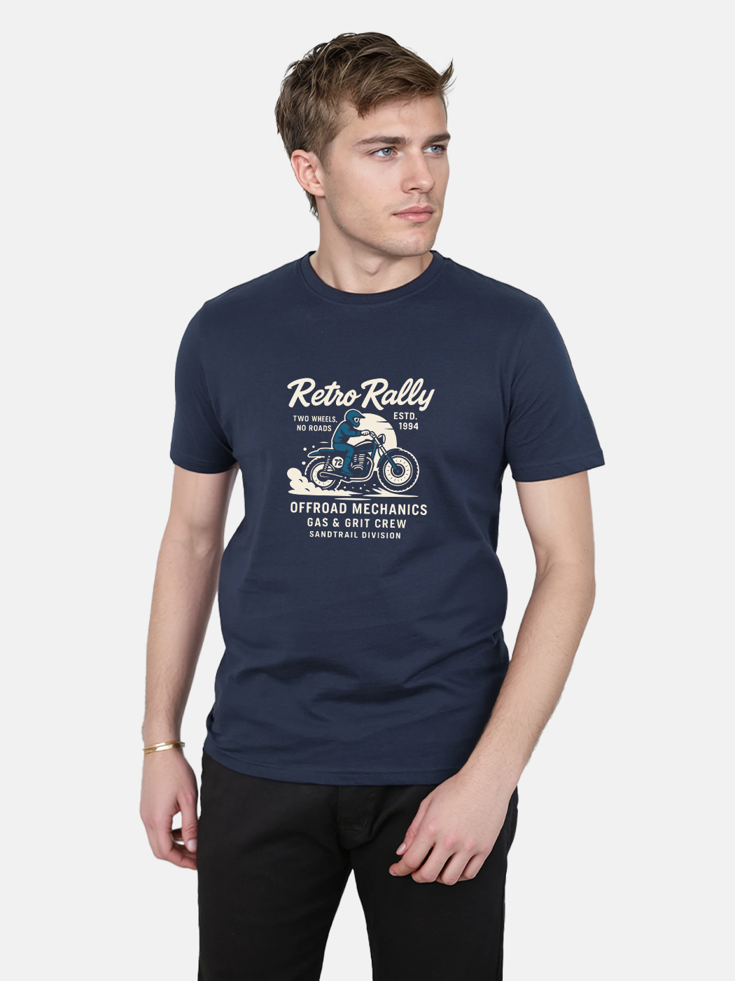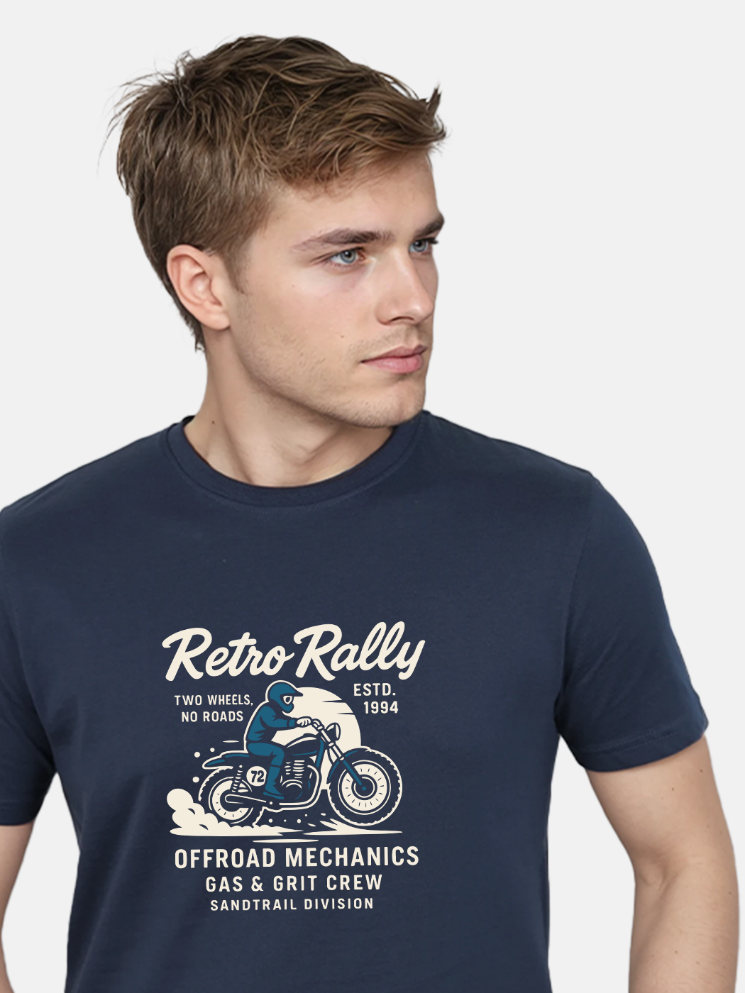 Retro Rally Printed T-Shirt for men with half sleeves. Perfect blend of comfort and casual style. Ideal for everyday wear, parties, or gifting.