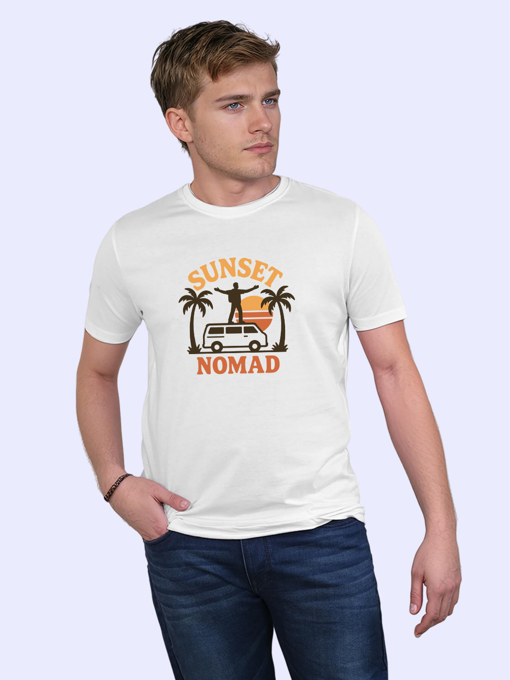 Sunset-inspired nomadic half sleeve T-shirt for men, perfect for beach trips and golden hour adventures.