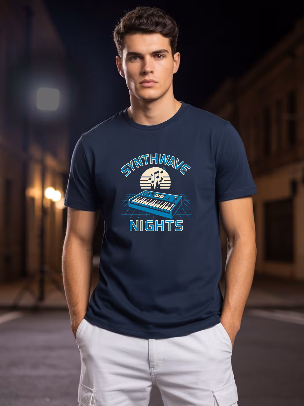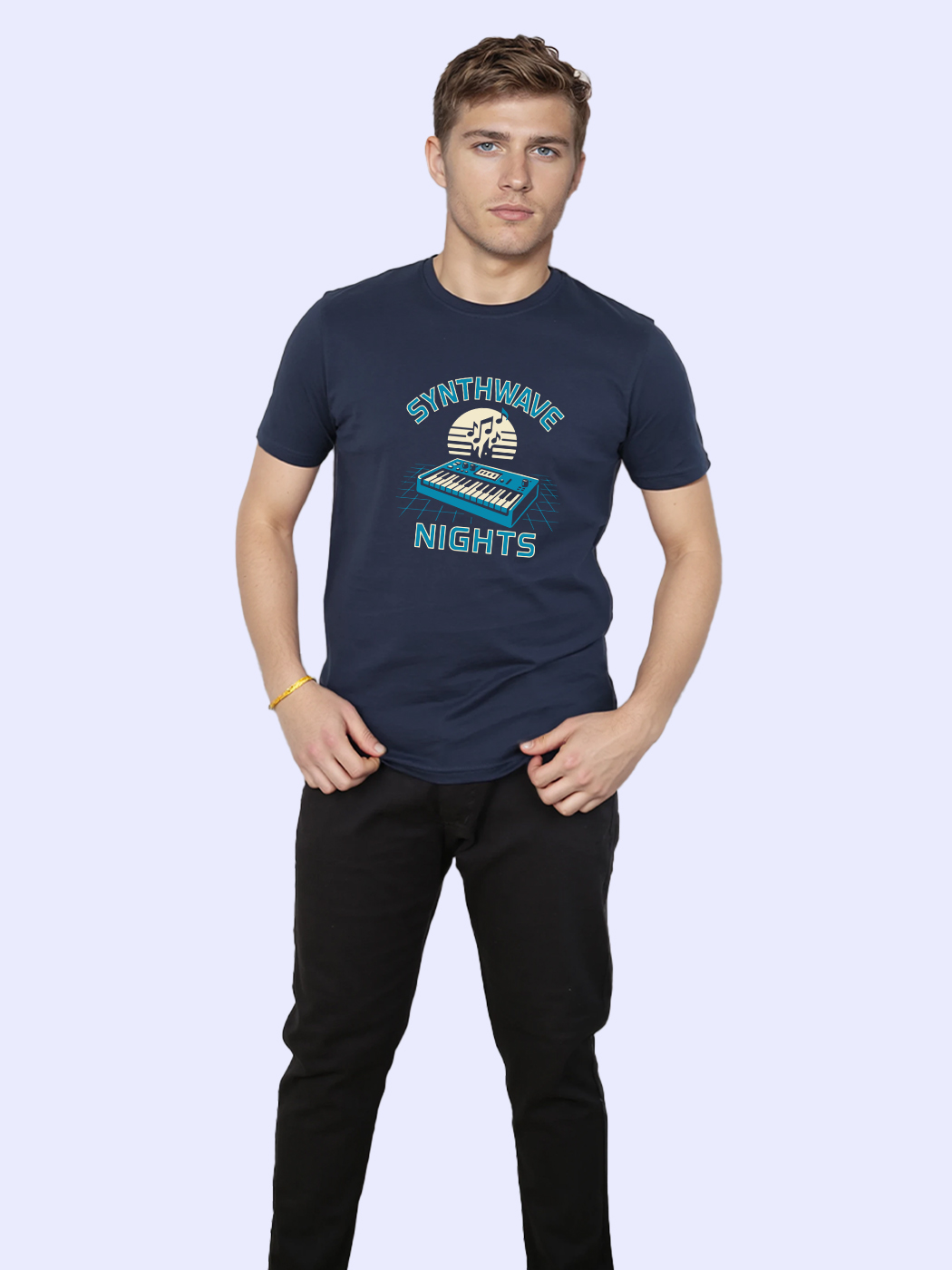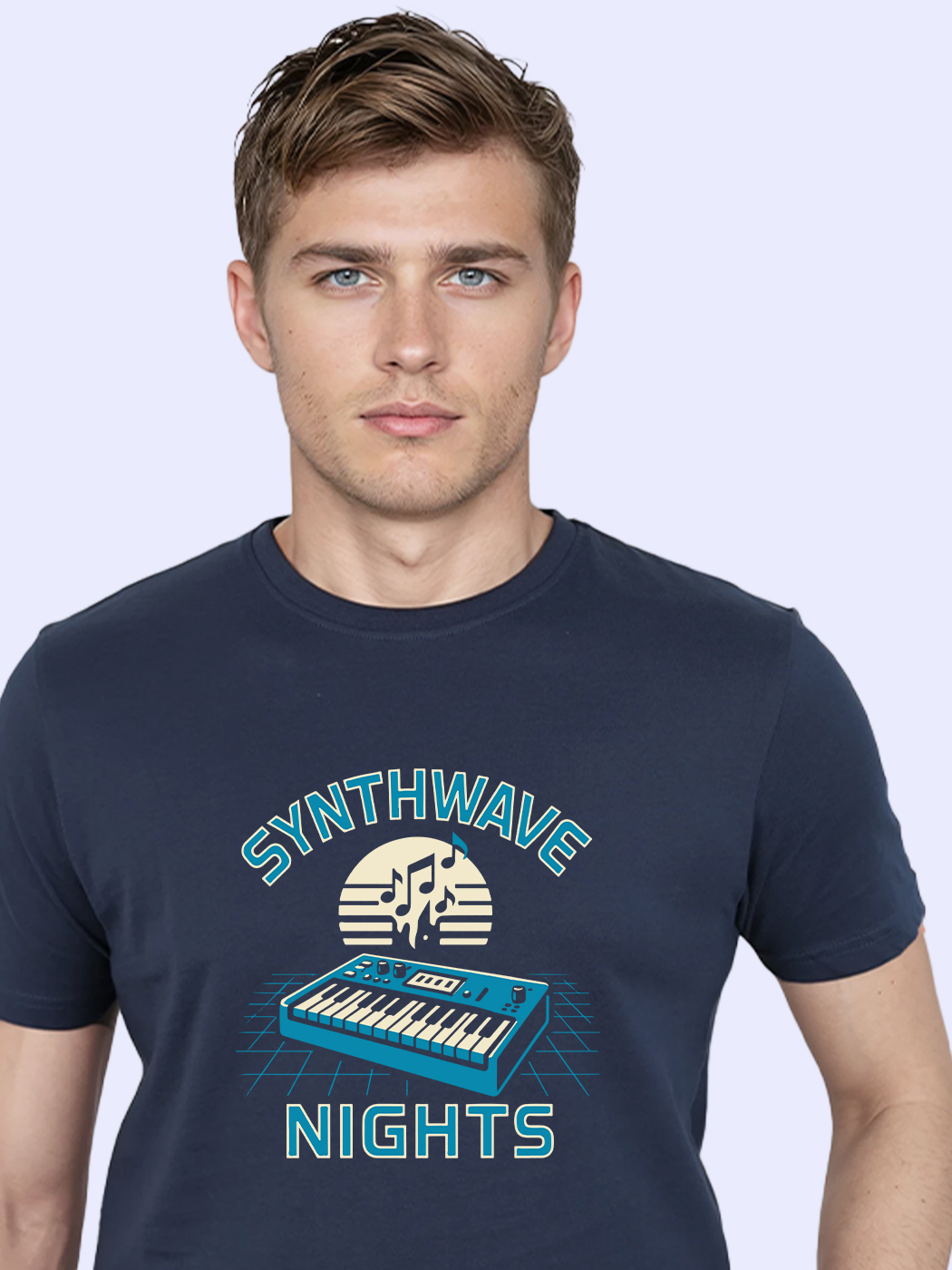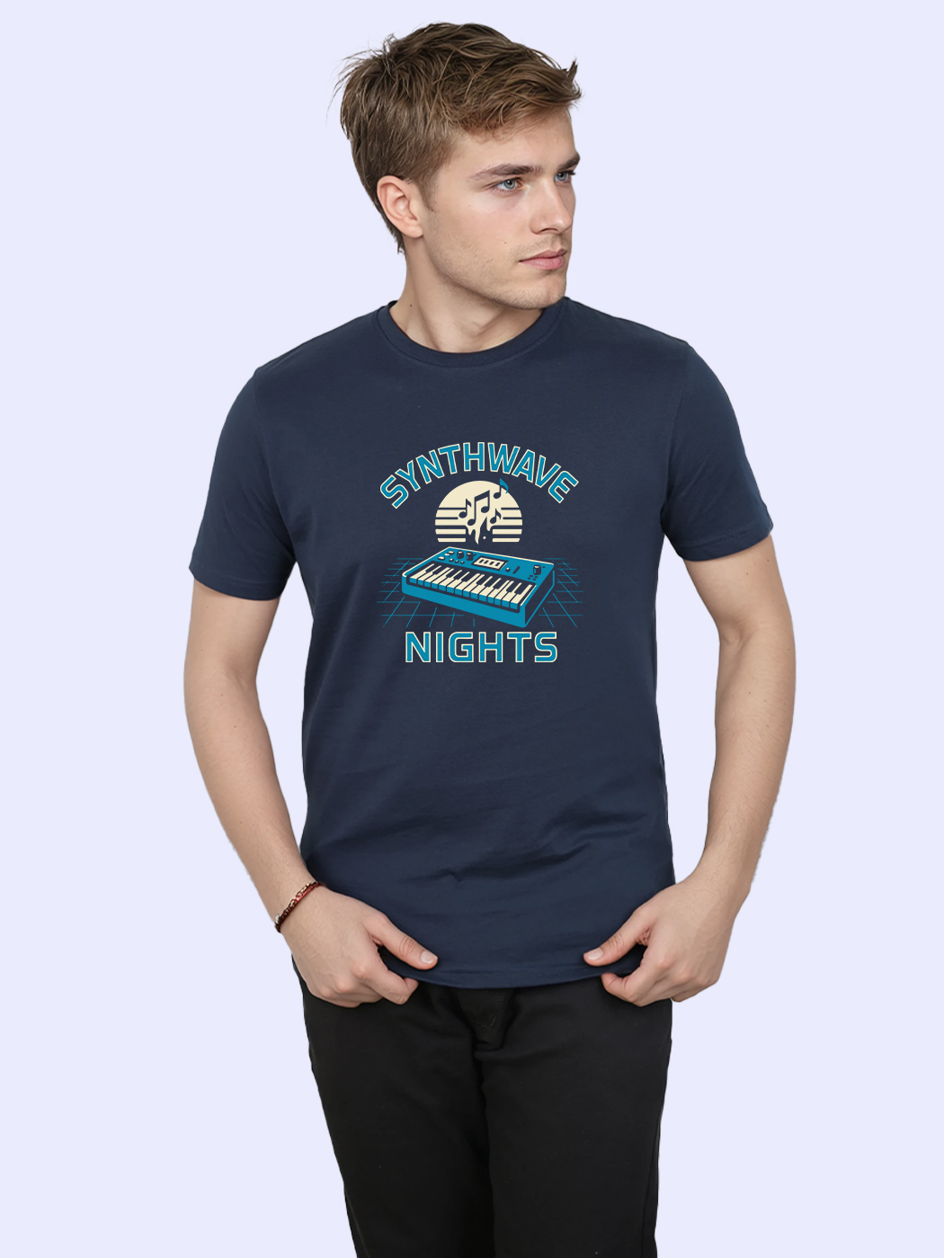 Retro-futuristic half sleeve T-shirt for men, inspired by synthwave aesthetics and neon nights.