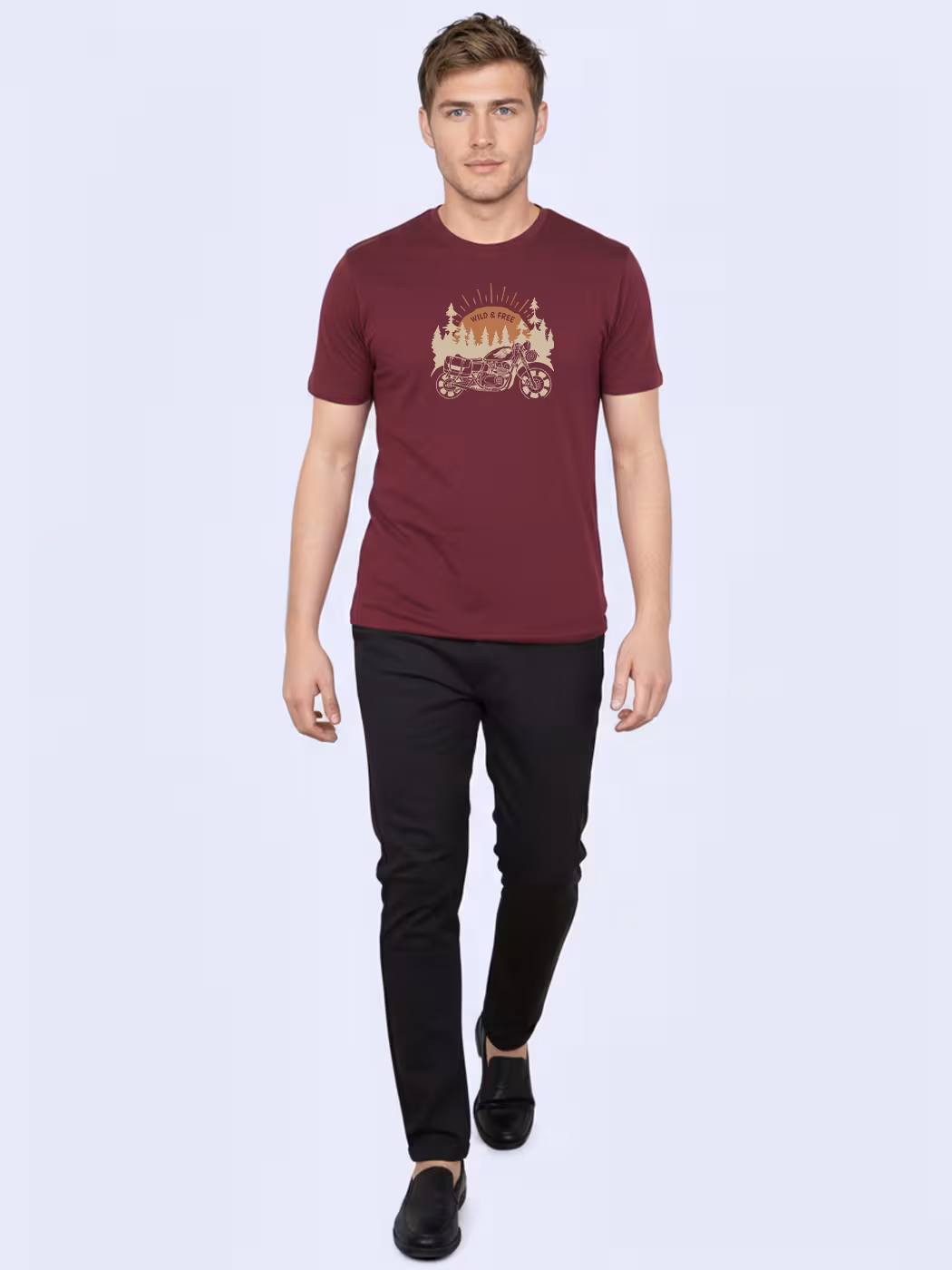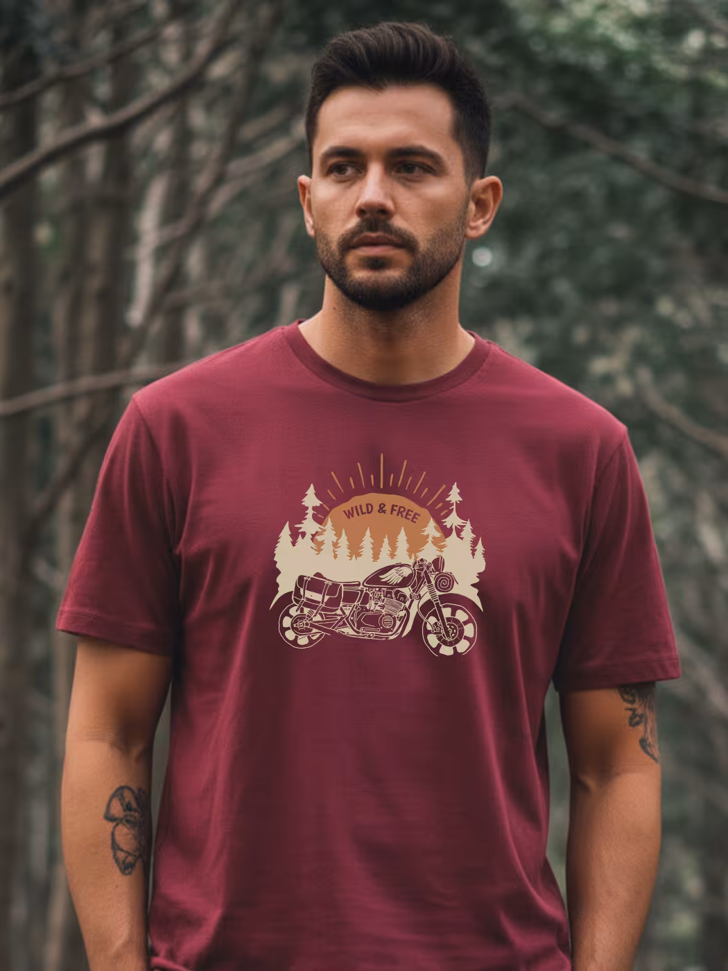 The Wild And Free T-Shirt For Men – Half Sleeve blends style and comfort with minimalist motorcycle-inspired graphics, soft cotton fabric, and a perfect fit for everyday rides or casual adventures.